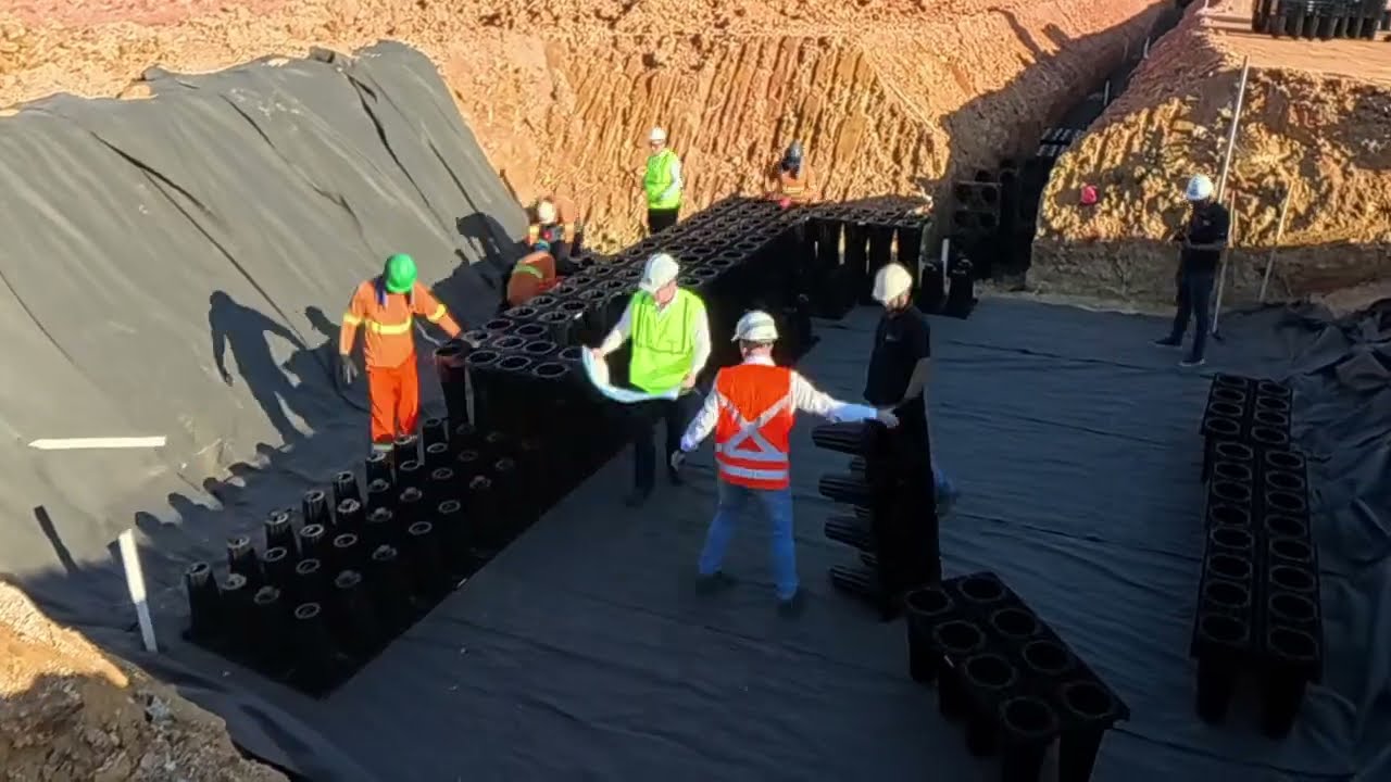 A ACO forneceu o sistema ACO Stormbrixx SD900 para um reservatório de retenção pluvial no pátio de veículos de uma transportadora em Porto Feliz (SP). A solução atendeu à necessidade de retenção e infiltração de águas de chuva, com instalação concluída em apenas 3 horas, gerando economia e ganho de área útil.